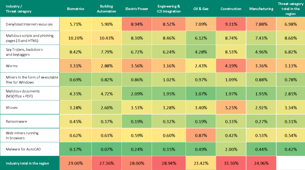 - Leader among industries in all regions in terms of internet threats. Ranks second in the region in terms of network folder threats. Third place in the region by the percentage of ICS computers on which threats from removable media were blocked.