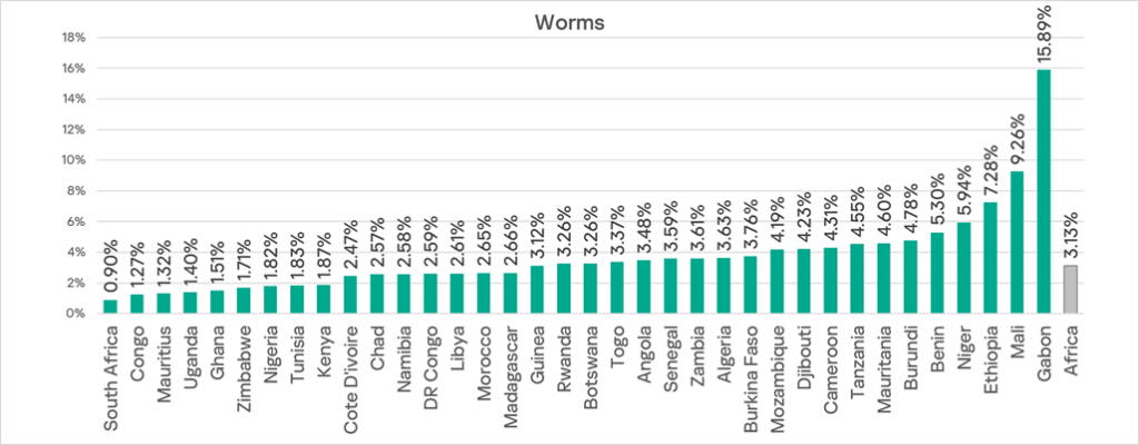 Self-propagating malware is the region’s worst problem: worm and virus rates each exceed the global average by 2.6 times.