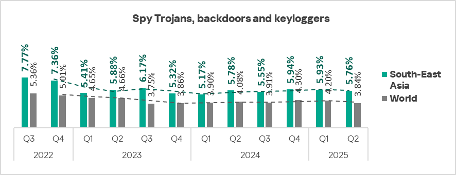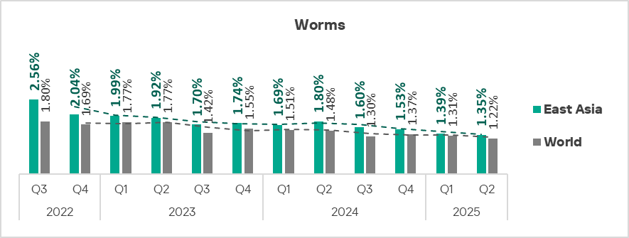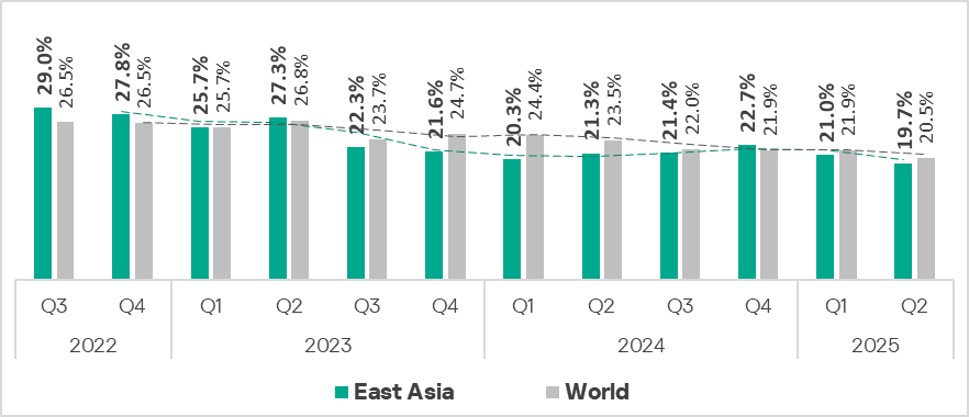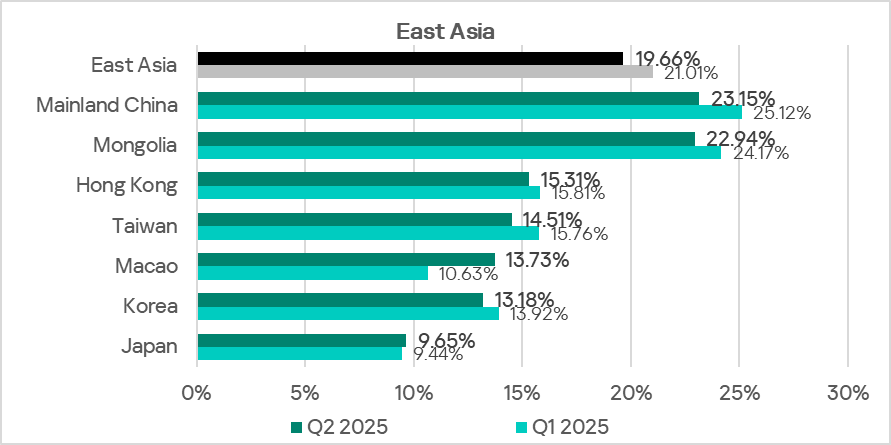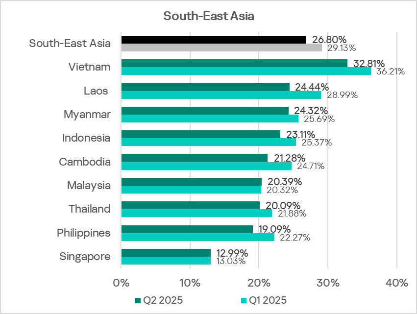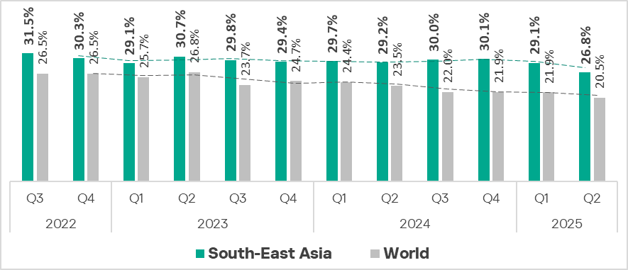 In Q2 2025, the percentage of ICS computers on which malicious objects were blocked in South-East Asia decreased by a notable 2.3 p.p. The region’s percentage figure has been declining for two consecutive quarters.