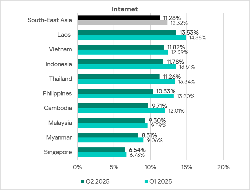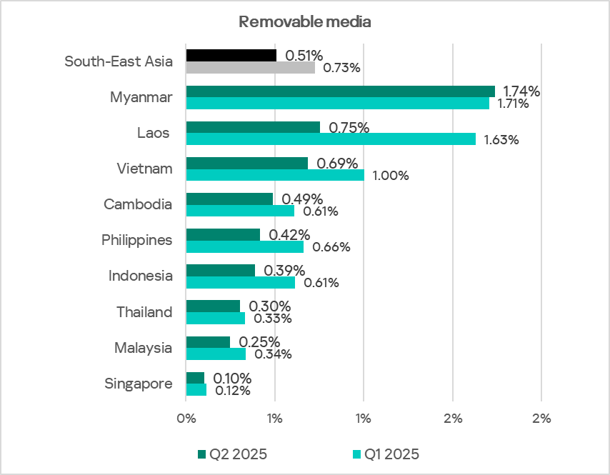 Among the countries of the region, Myanmar leads by a wide margin, with 1.74% of ICS computers on which threats from removable media were blocked. Notably, the country was second to last in the ranking for email clients. Percentage values for the other countries range from 0.10% in Singapore to 0.75% in Laos.