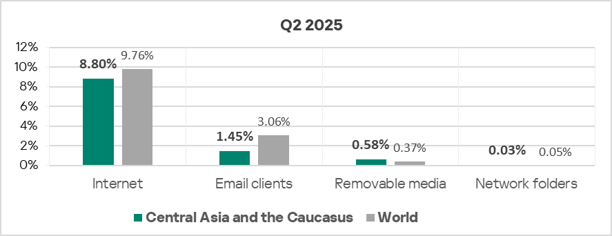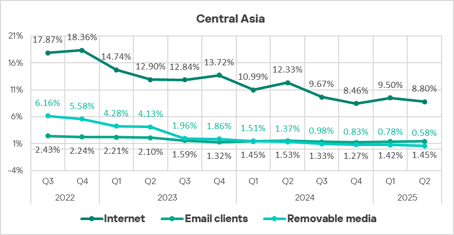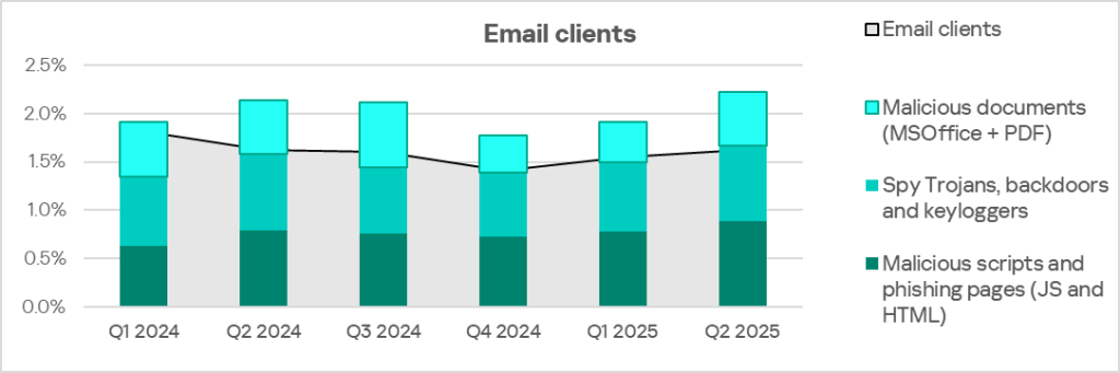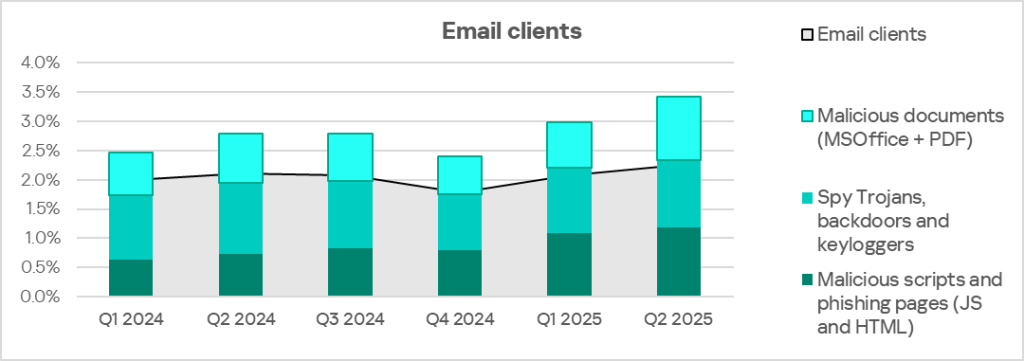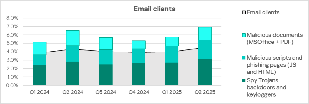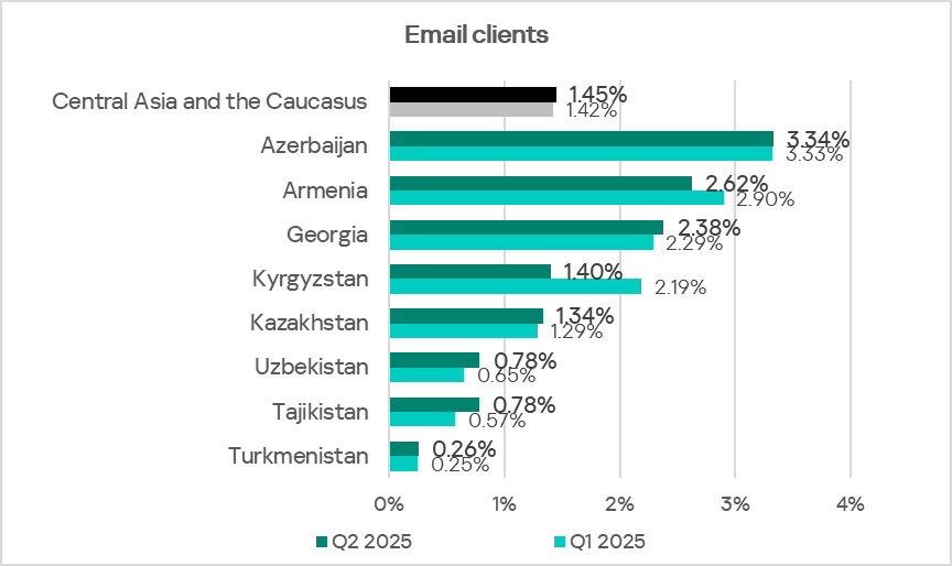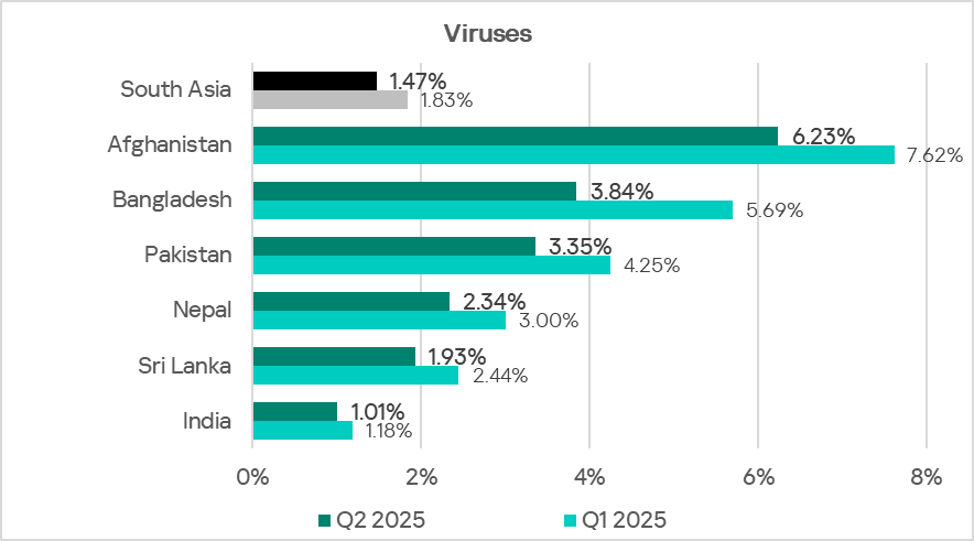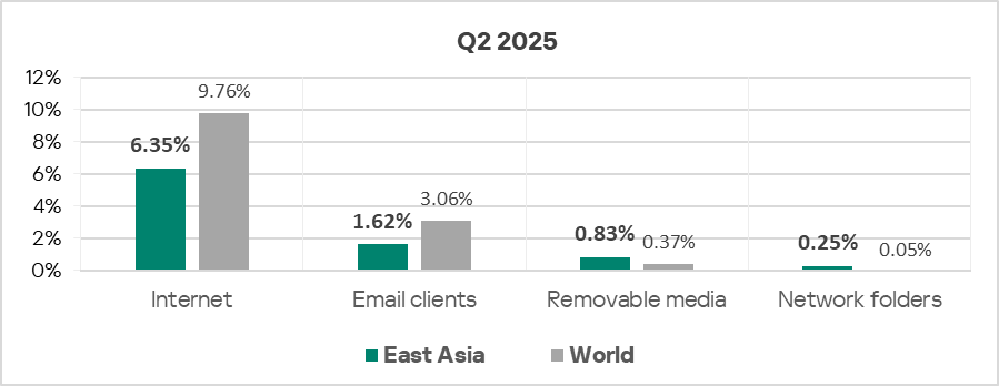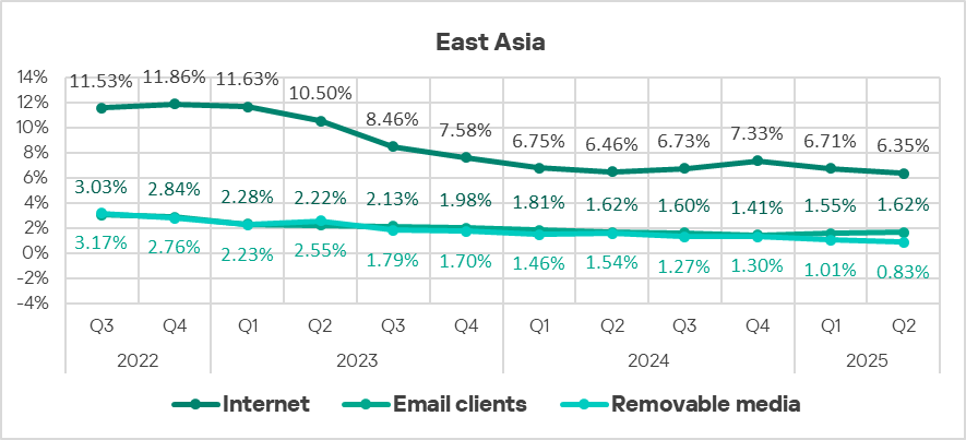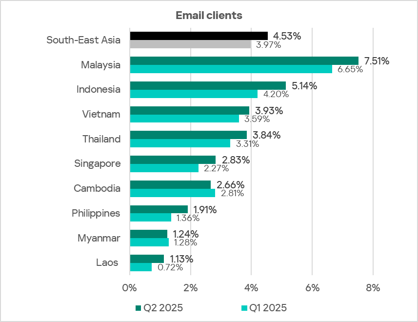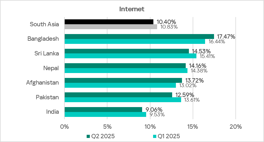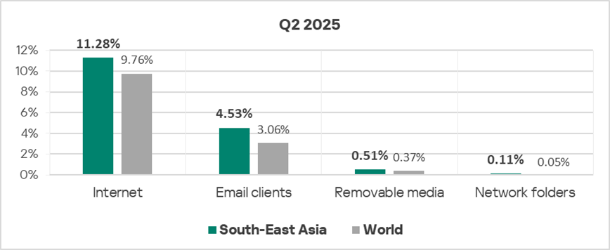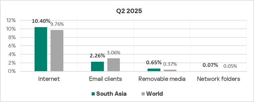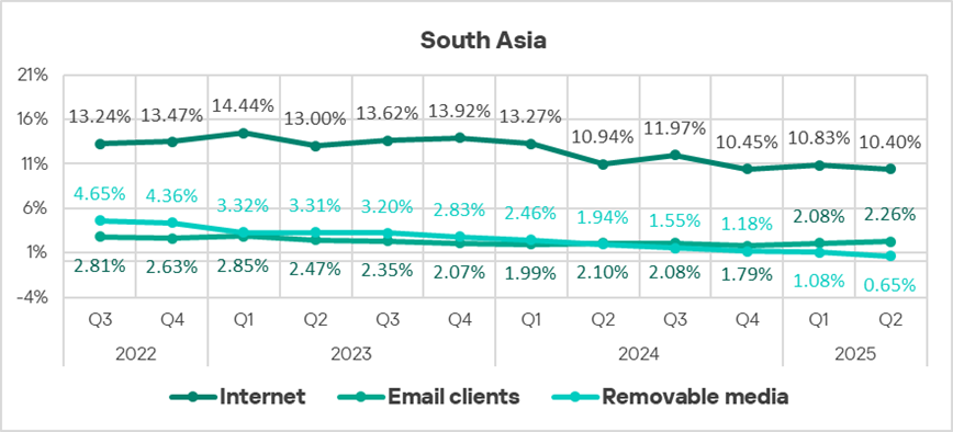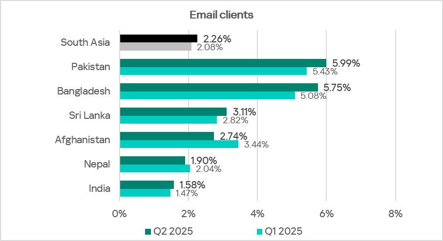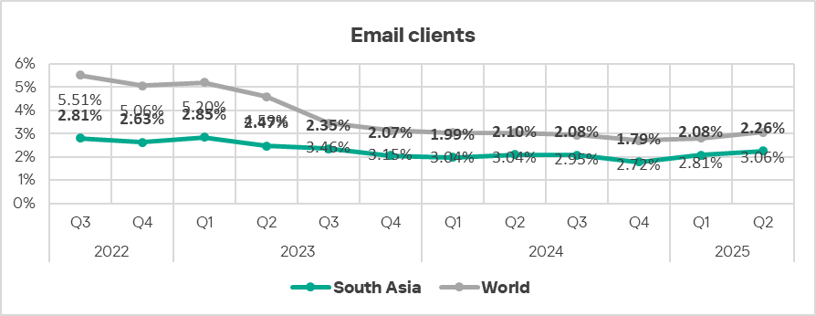 In Q2 2025, South Asia exceeded global averages for all threat sources except email clients: