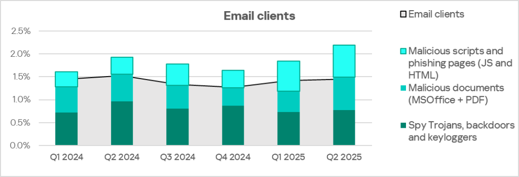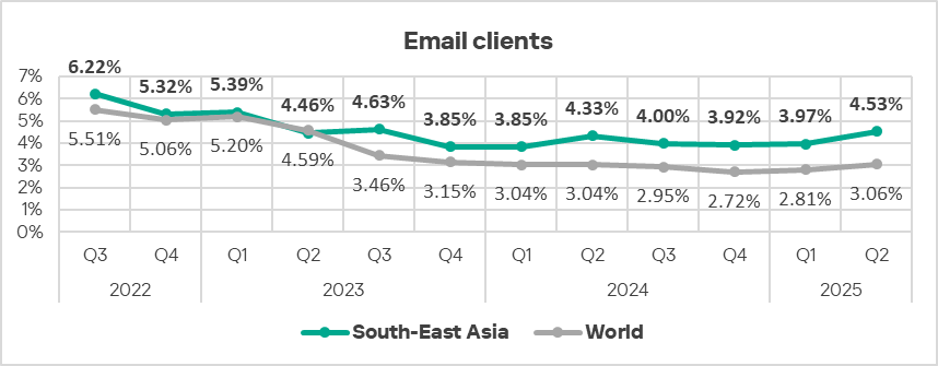 The percentage of email clients as a source of threats in the region has been increasing for two consecutive quarters.