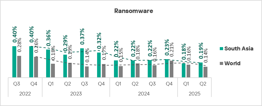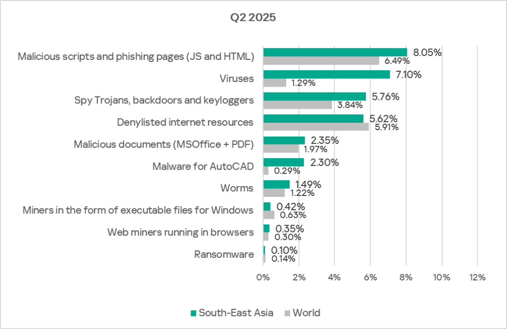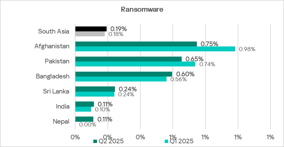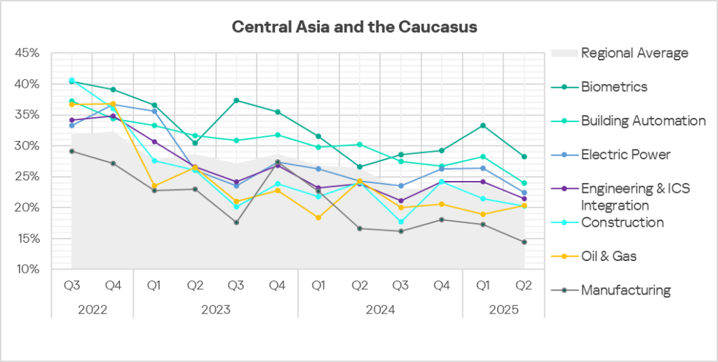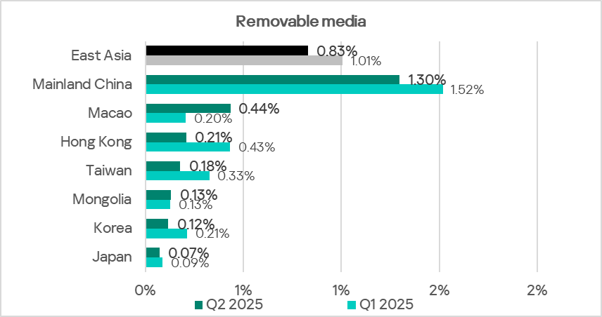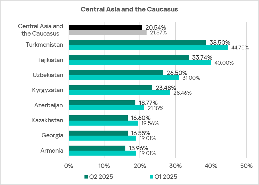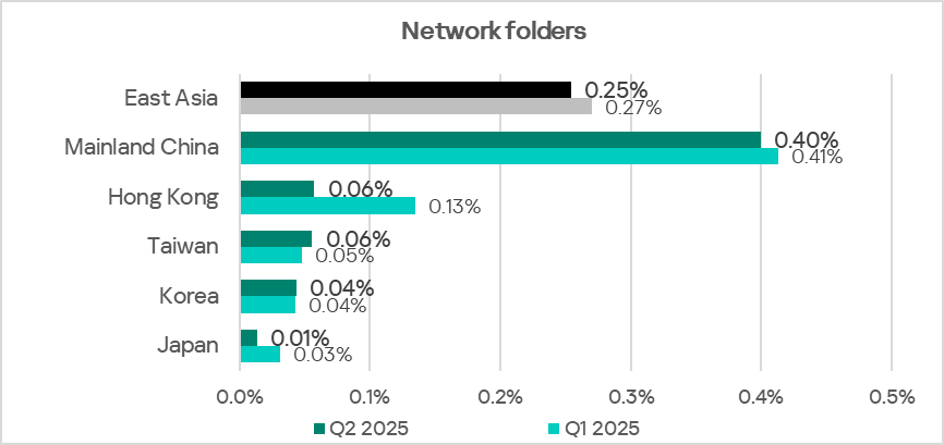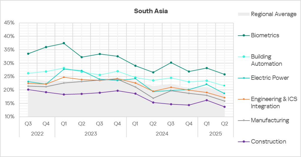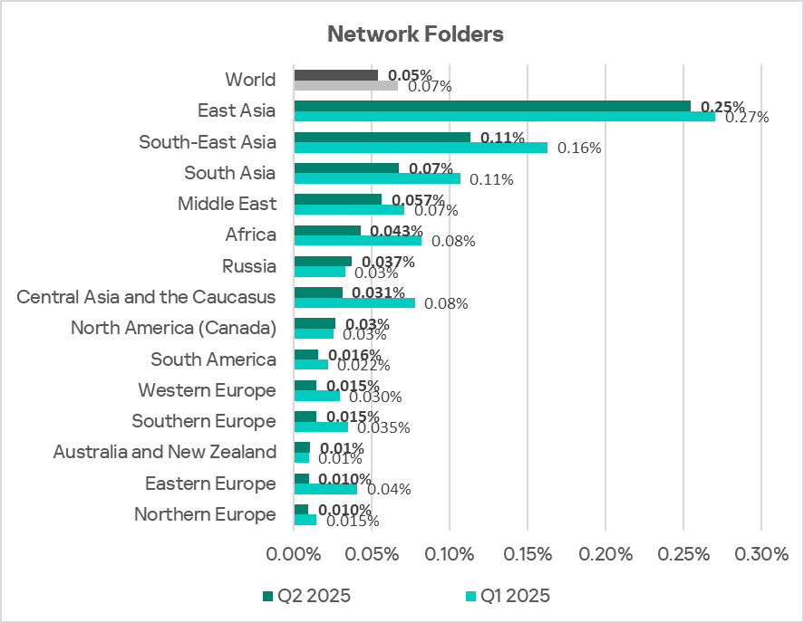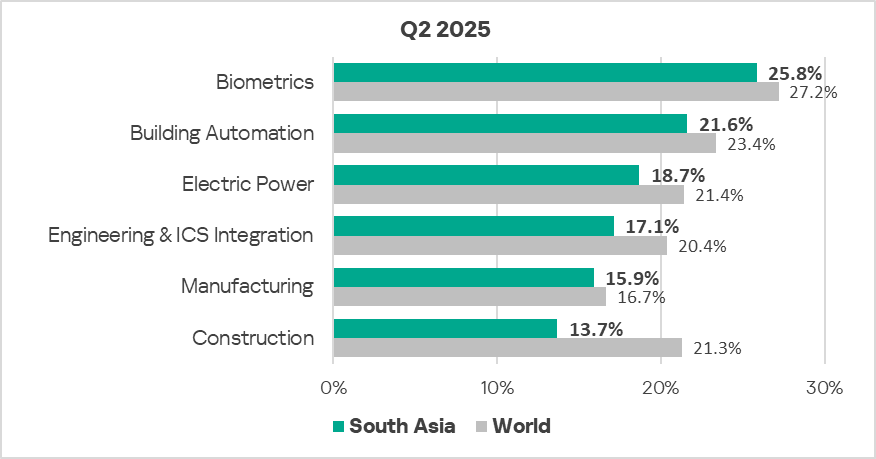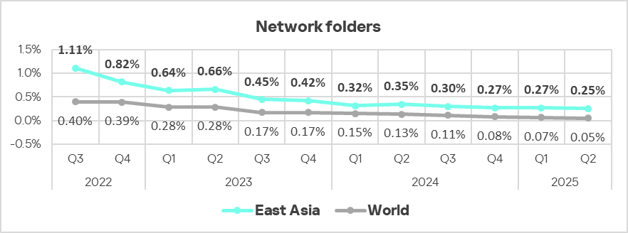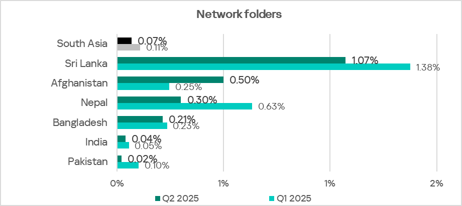 South Asia ranks third among regions globally for the percentage of ICS computers on which threats from network folders were blocked. In Q2 2025, the region’s figure (0.07%) was 7 times higher than in Northern Europe, which was at the bottom of the ranking.