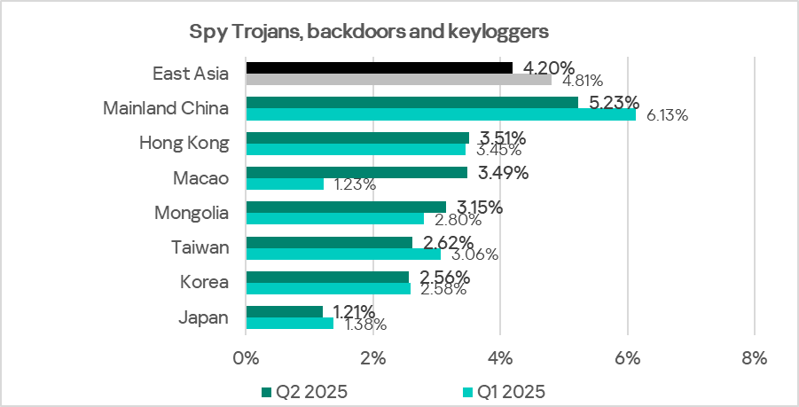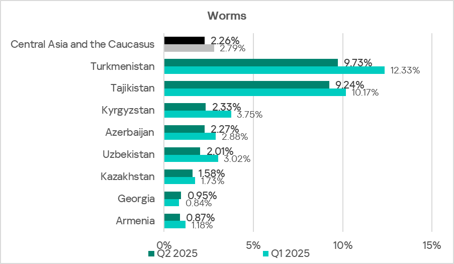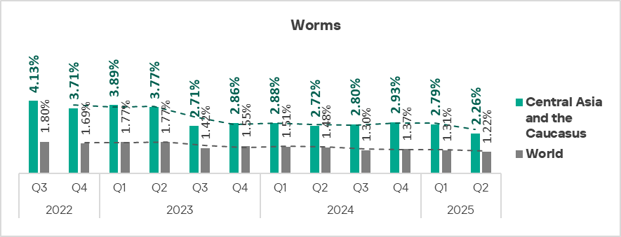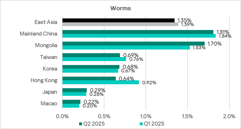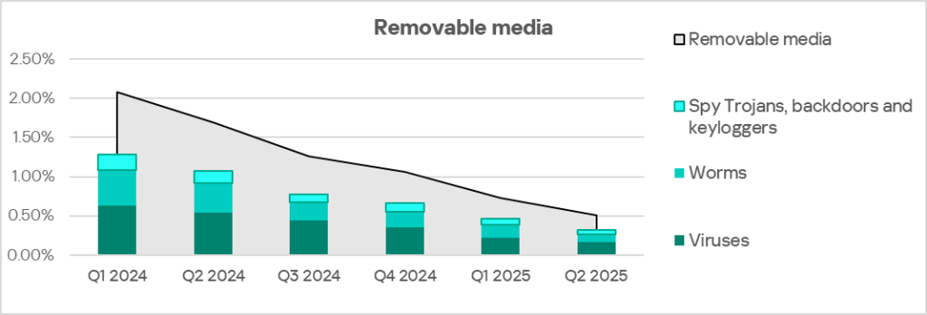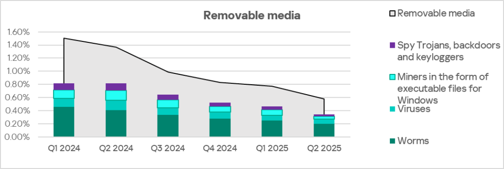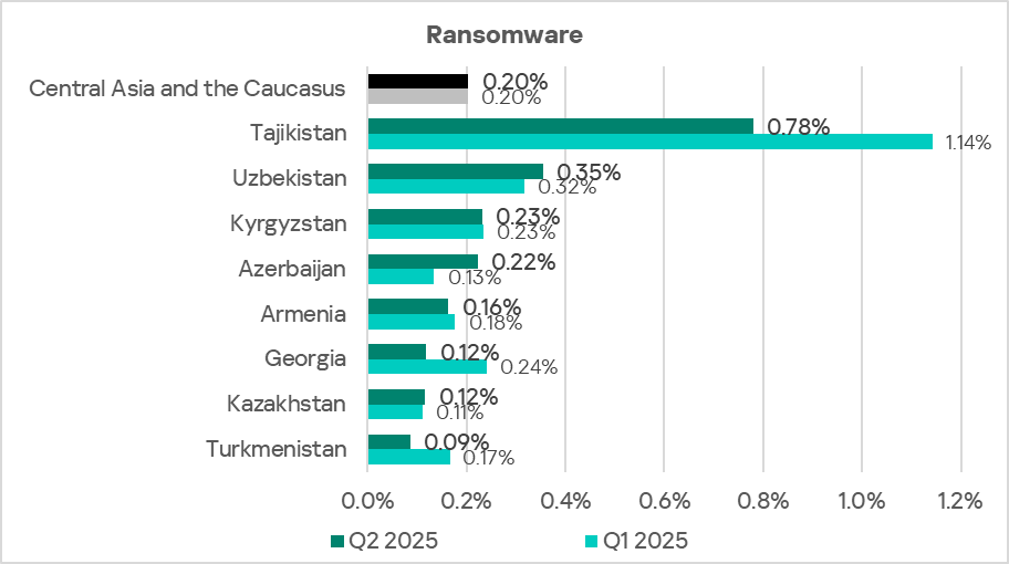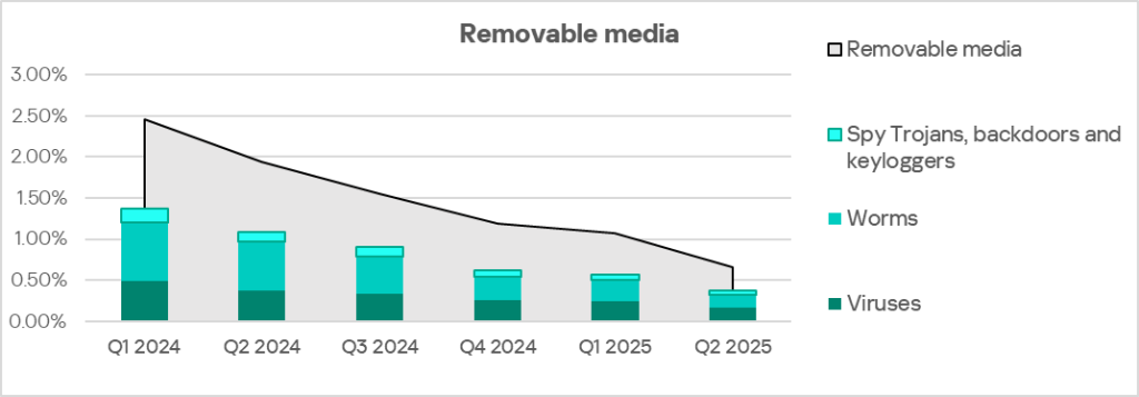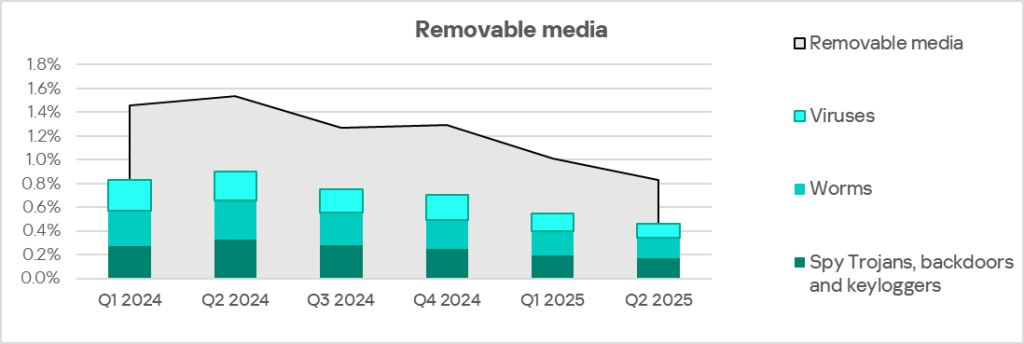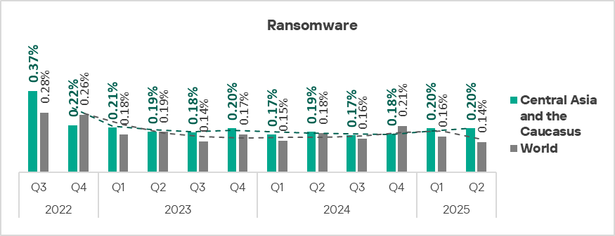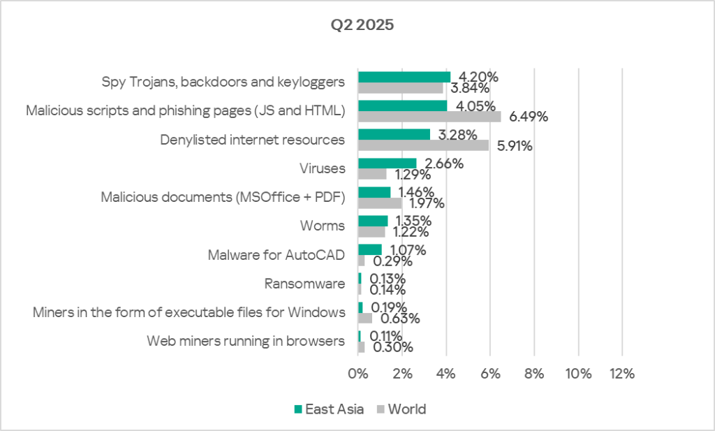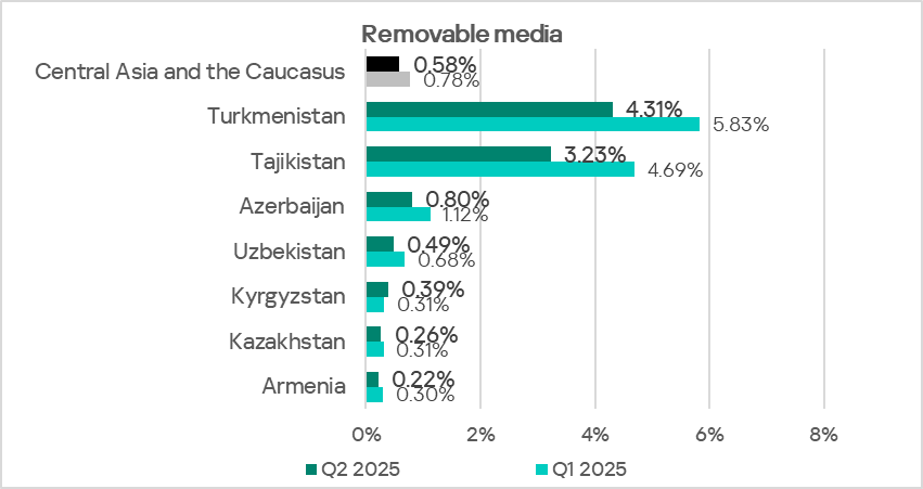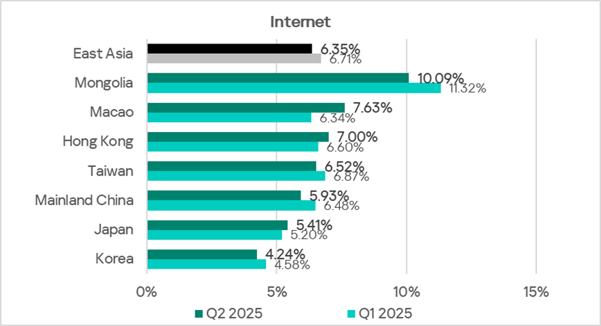 South Asia ranks third among regions globally for the percentage of ICS computers on which threats from network folders were blocked. In Q2 2025, the region’s figure (0.07%) was 7 times higher than in Northern Europe, which was at the bottom of the ranking.
