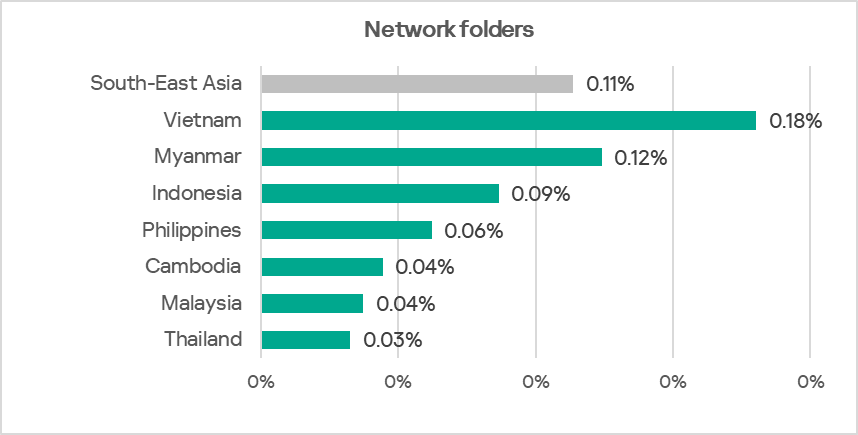 South-East Asia ranks second among regions in terms of the percentage of ICS computers on which threats from network folders were blocked, at 0.11%. This figure is 2.1 times higher than the global average.