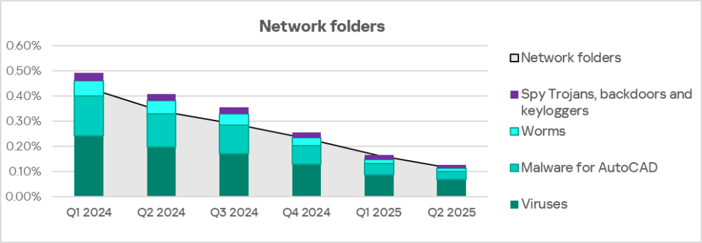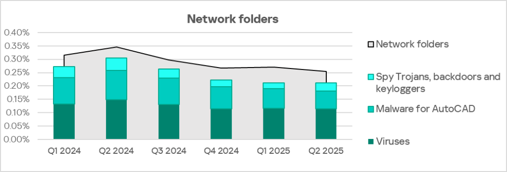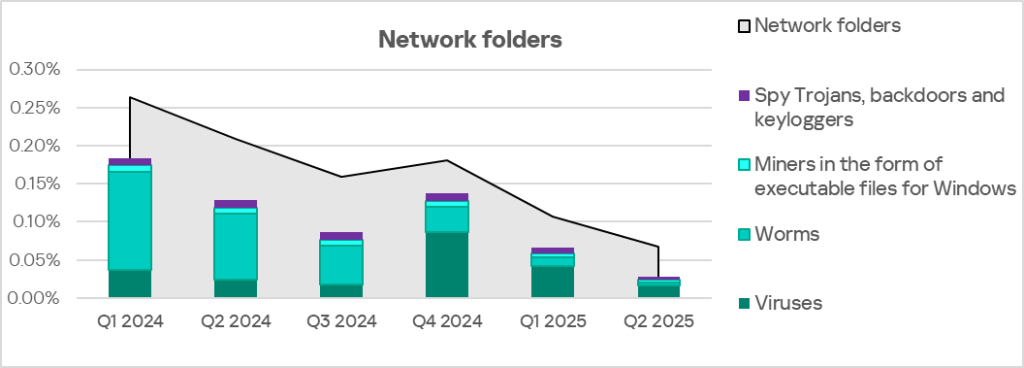 The main threats spreading through network folders are viruses, worms, miners in the form of executable files for Windows, and spyware.