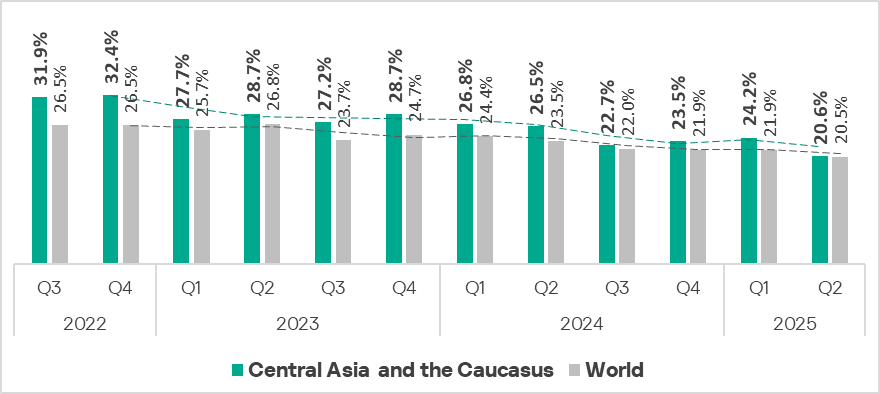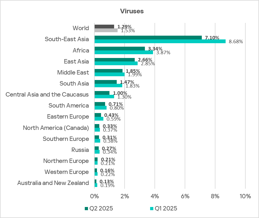 In Q2 2025, the virus rate (1.47%) was 11.6 times higher than in Australia and New Zealand, which were at the bottom of the ranking.