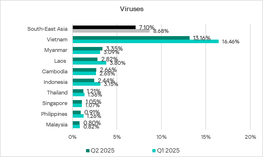 In South-East Asia, viruses rank second in the regional ranking of malware categories by percentage of ICS computers on which they were blocked. This is the highest position for viruses among all regional rankings. The regional figure exceeds the global average by a factor of 5.5, making it the highest value in the world.