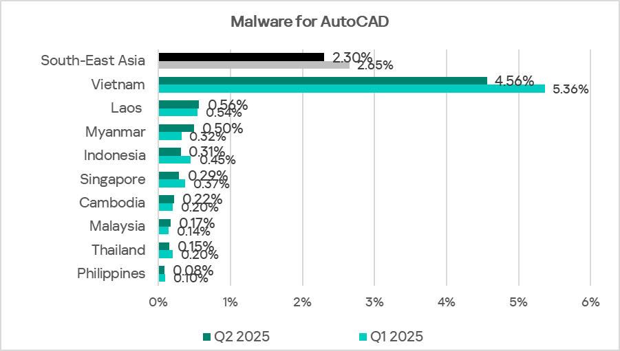 This is mainly due to the situation in Vietnam, which leads the region by a wide margin in terms of threats blocked in network folders, viruses, and malware for AutoCAD.
