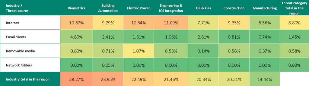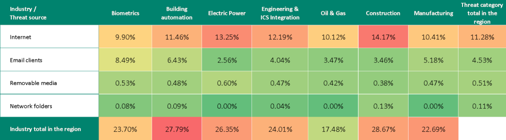 • Leader among industries in the region in terms of the percentage of ICS computers on which threats from removable media were blocked. Second in terms of internet threats.