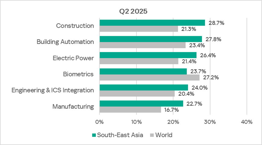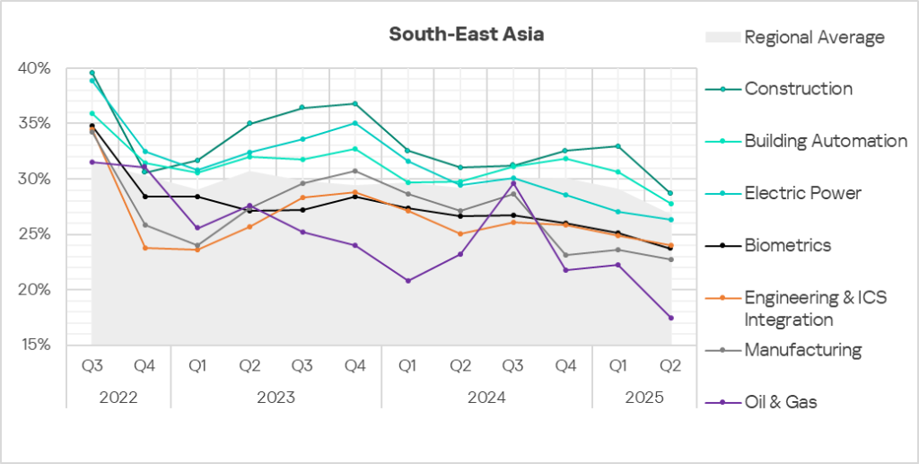 Threat category indicators for industries in South-East Asia, Q2 2025