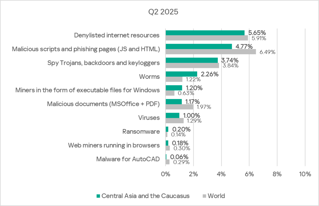 • Fourth place in terms of malicious scripts and phishing pages, denylisted internet resources, and worms.