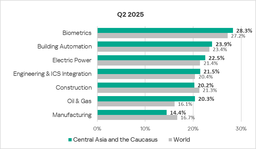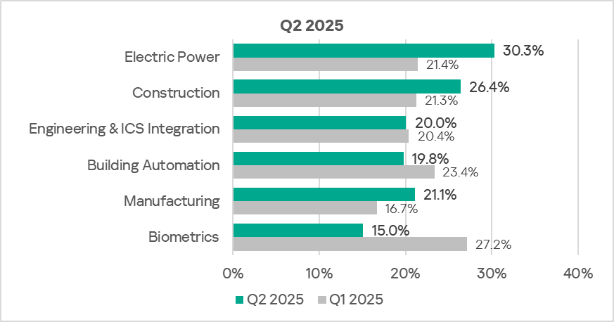 In Q2 2025, the percentage of ICS computers on which malicious objects were blocked fell across all industries.