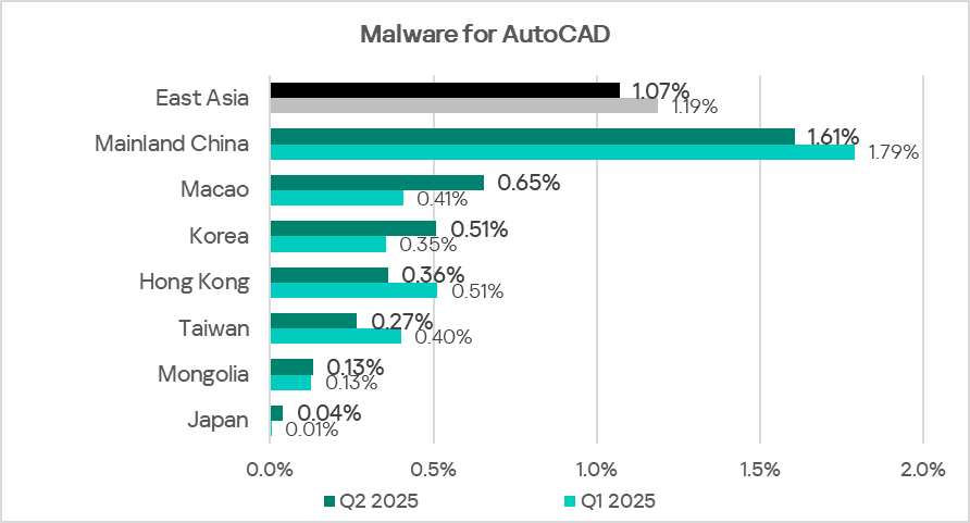 Malware for AutoCAD is in second-to-last place in the global ranking of threat categories by percentage of ICS computers on which various threats were blocked, while in the regional ranking, it is in sixth place, with a percentage that exceeds the global average by a factor of 7.9 and is the highest value in the world.