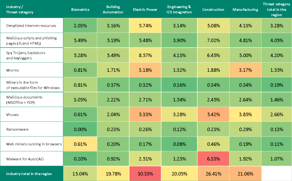 • Construction is also ahead of other industries in the region in terms of the following threat categories: malware for AutoCAD, web miners.