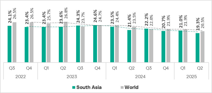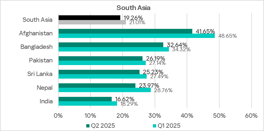 In Q2 2025, South Asia ranked ninth among all regions for the percentage of ICS computers on which malicious objects were blocked. The region’s rate dropped by 1.7 pp over the quarter, ending at 19.3%. This is 1.7 times higher than in Northern Europe, which ranks last.
