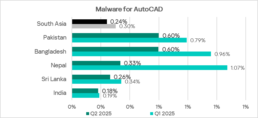 Pakistan and Bangladesh percentage the lead in blocked malware for AutoCAD (0.6% each).