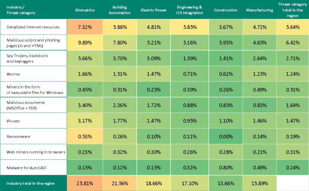 All industries in the region show high values for internet threats — both as a source and by category (denylisted internet resources, malicious scripts, and phishing pages).
