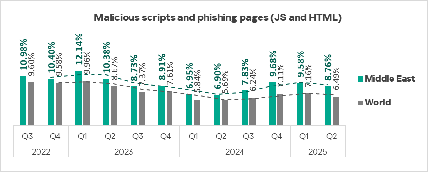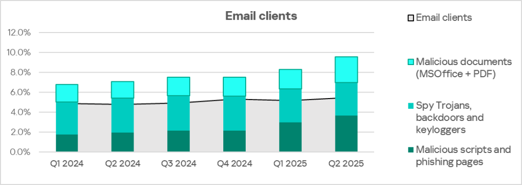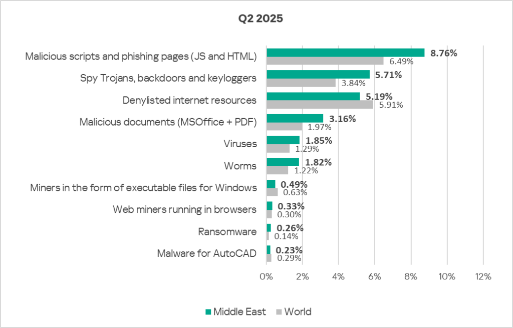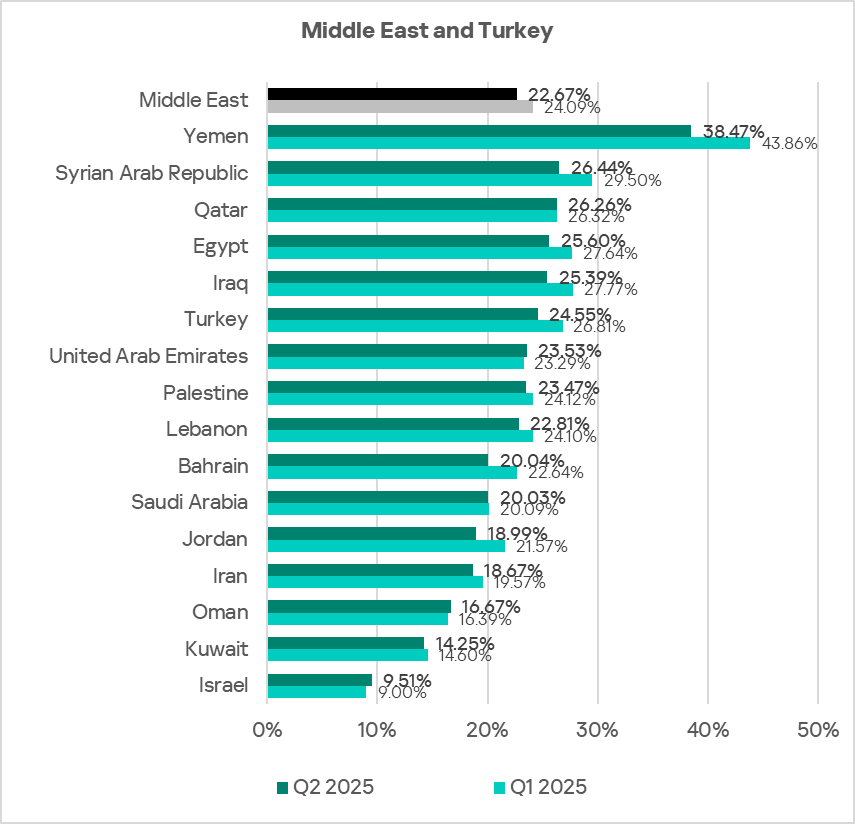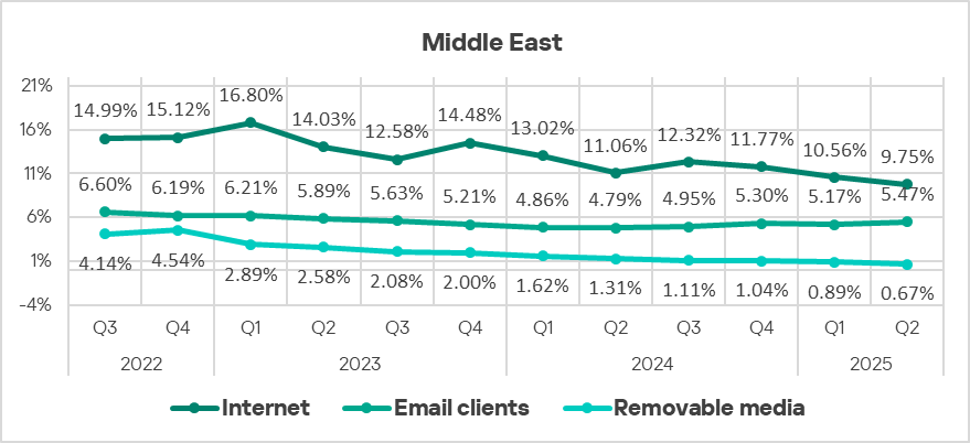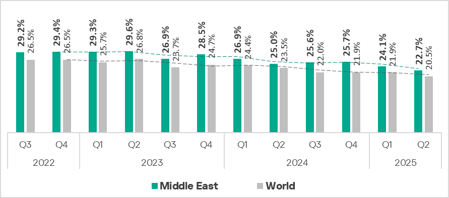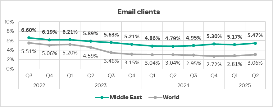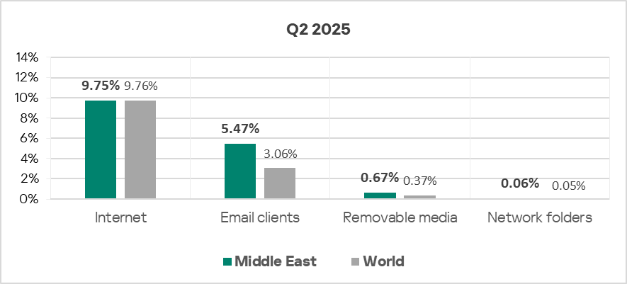 Email clients have shown a rising trend as a threat source in the region since Q3 2024. In Q2 2025, the Middle East ranked third globally by the percentage of ICS computers on which threats from email clients were blocked. The region’s figure is 6.8 times higher than Russia’s, which ranks last.