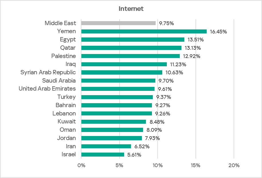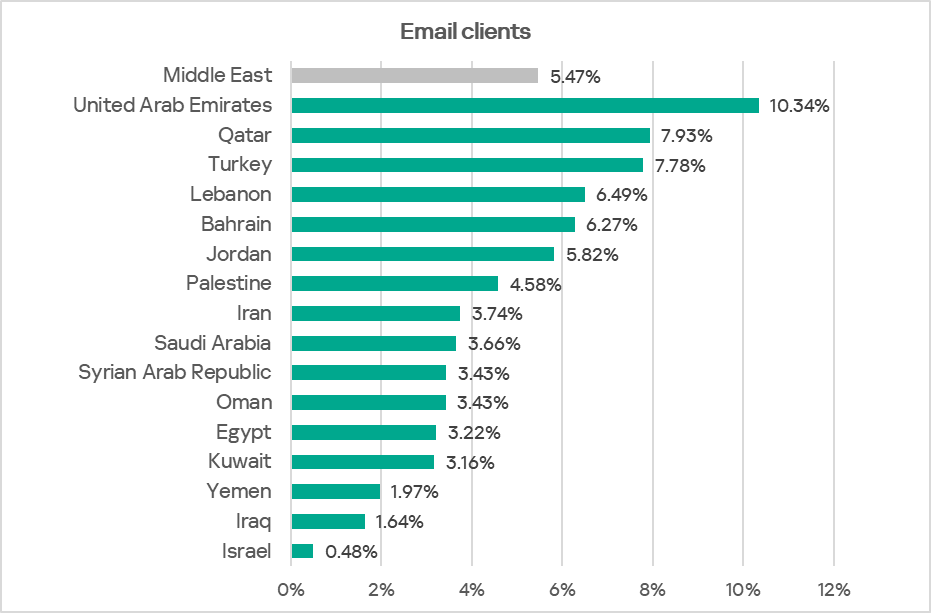 In the Middle East, the percentage of ICS computers on which threats from email clients were blocked was 1.8 times higher than the global average.