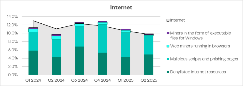 The main categories of internet threats blocked on ICS computers in the region are denylisted internet resources, malicious scripts and phishing pages, and miners.