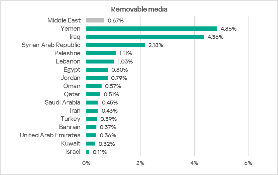 In the Middle East, the percentage of ICS computers on which threats from removable media were blocked was 1.8 times higher than the global average.