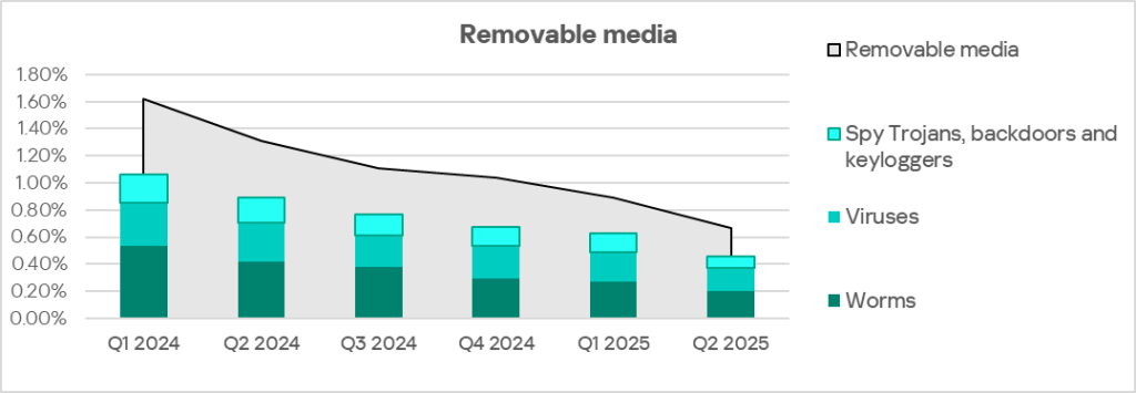 The worm rate, similar to the overall percentage of threats from removable media, is gradually decreasing. Viruses display a more complex trend.