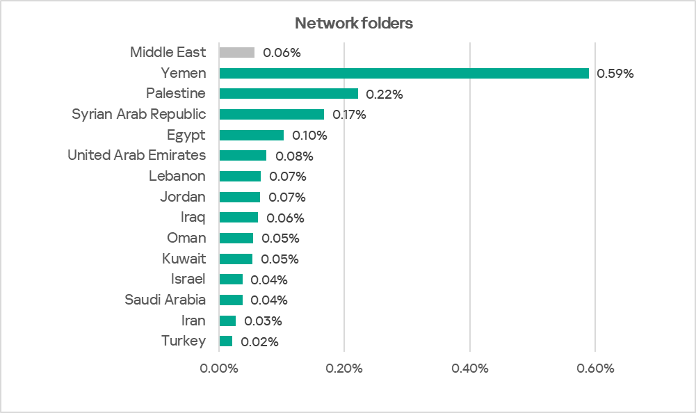 In terms of ICS computers on which threats from network folders were blocked, the Middle East ranked fourth globally, with 0.06%. This is 5.9 times higher than Northern Europe, which had the lowest figure.