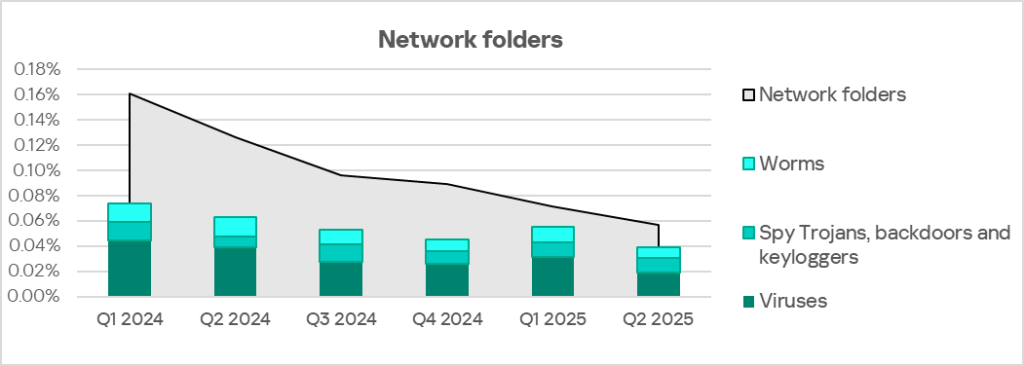 The main categories of threats spreading through network folders in the region are worms, viruses, and spyware.