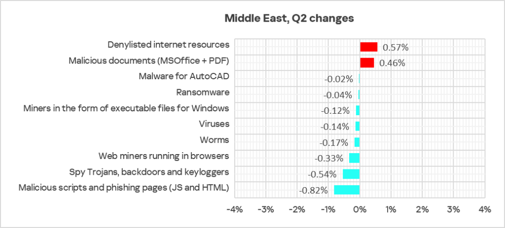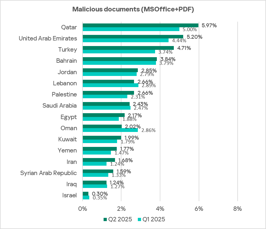 For threats from email clients, the UAE, Qatar, and Turkey hold the top positions. These same countries also rank among the leaders in malicious scripts and phishing pages, malicious documents, and spyware.