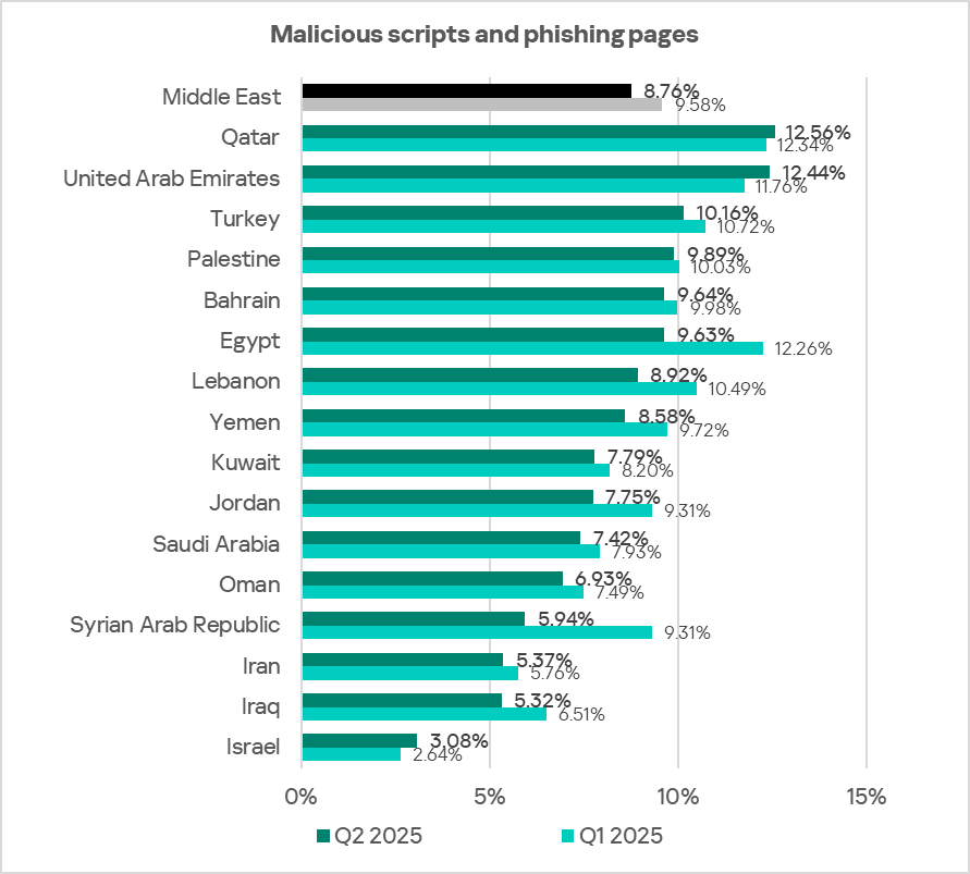 The top three countries in this ranking — the UAE, Qatar, and Turkey—are also among the leaders in malicious scripts and phishing pages, malicious documents, and spyware.