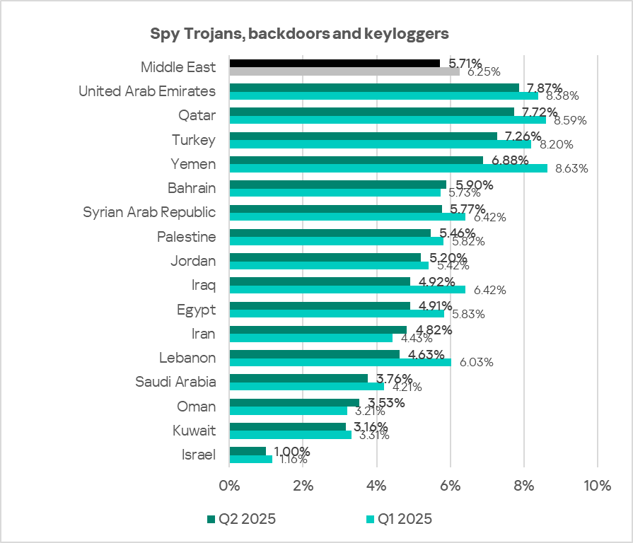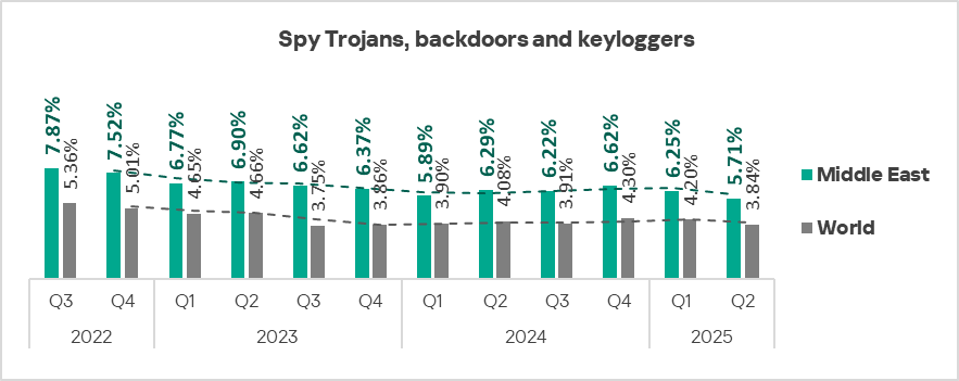 Since Q3 2023, the spyware rate in the Middle East has fluctuated between 5.71% and 6.62%. In Q2 2025, it reached its lowest level since Q3 2022.