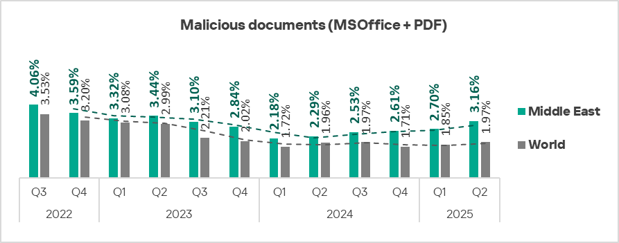 Malicious documents are spread primarily via email. The Middle East ranks third globally both in email client threats and malicious documents. The malicious document rate in the region is 3.16%, 4.9 times higher than Northern Europe, which had the lowest figure.