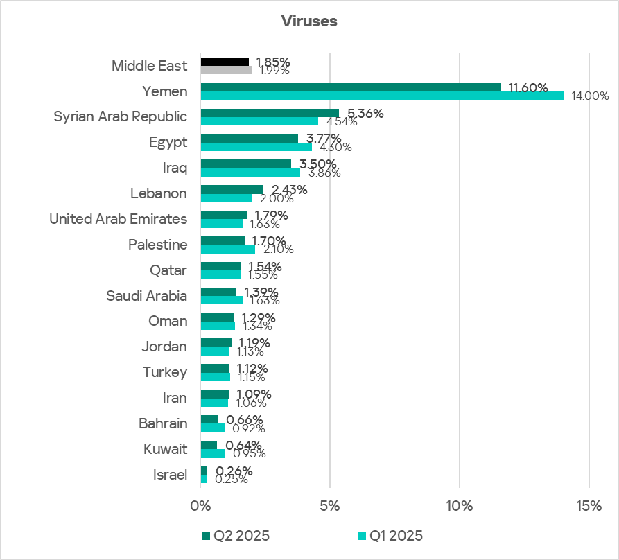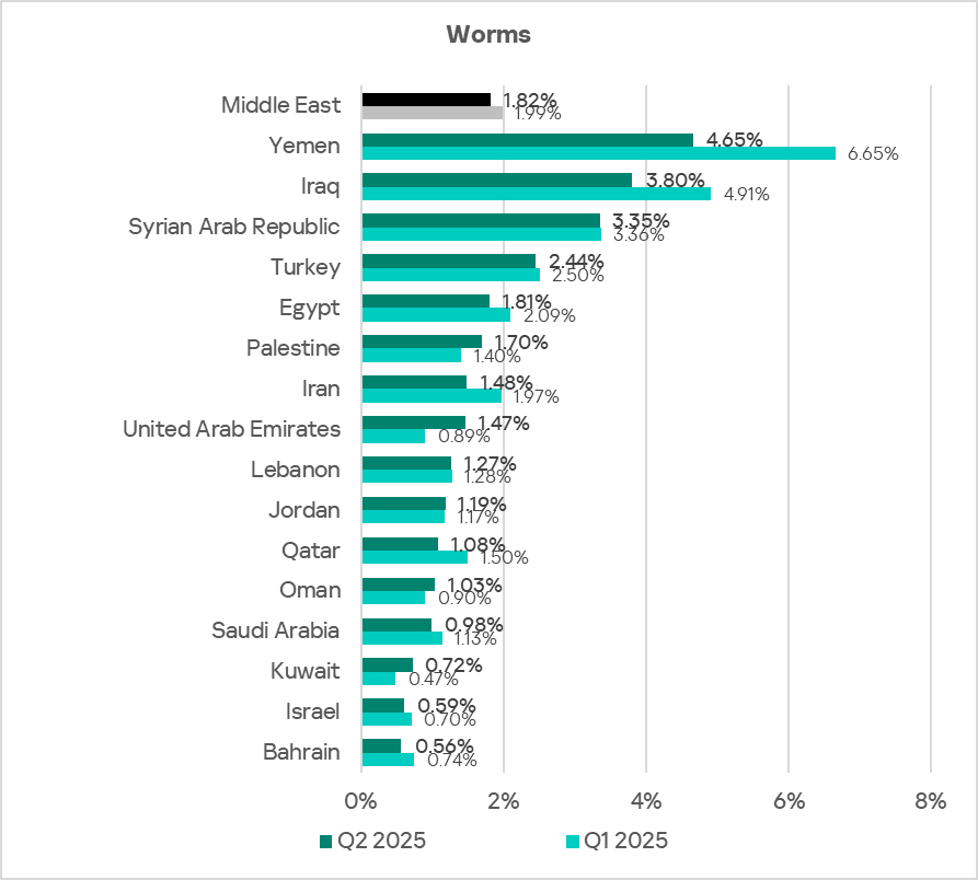 Among the region’s countries and territories, Yemen leads in both worms and viruses, with a particularly wide margin in the case of viruses.