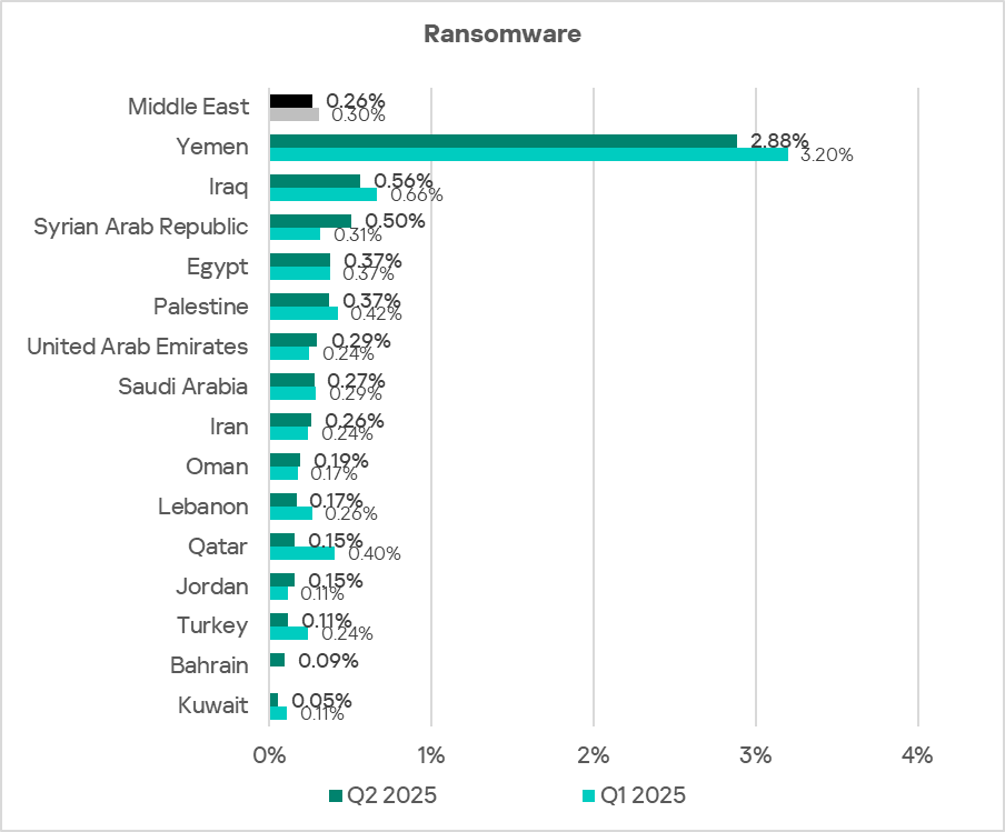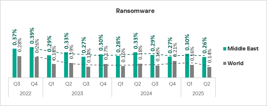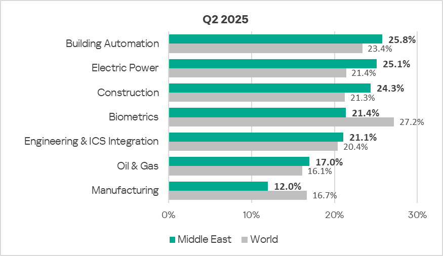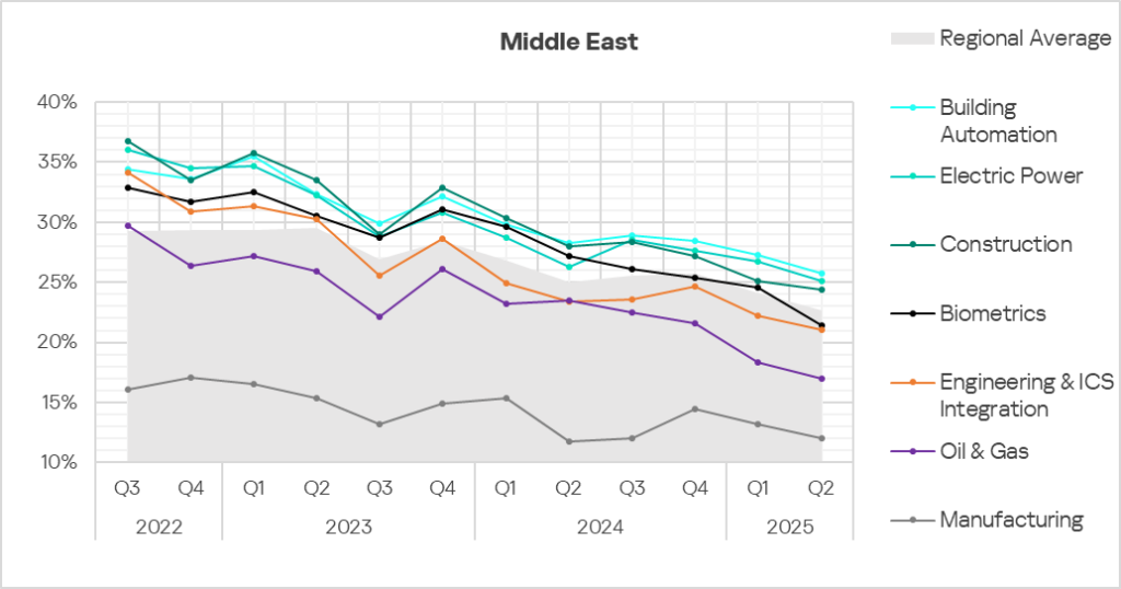 In Q1 and Q2 2025, the Middle East ranked second globally by the percentage of ICS computers on which ransomware was blocked (in 2024, the region topped this ranking).