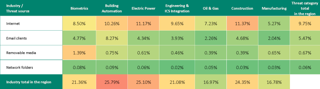 For ICS computers on which threats from the internet were blocked, the Middle East ranked fourth globally, with a rate 1.5 times higher than the lowest (East Asia).