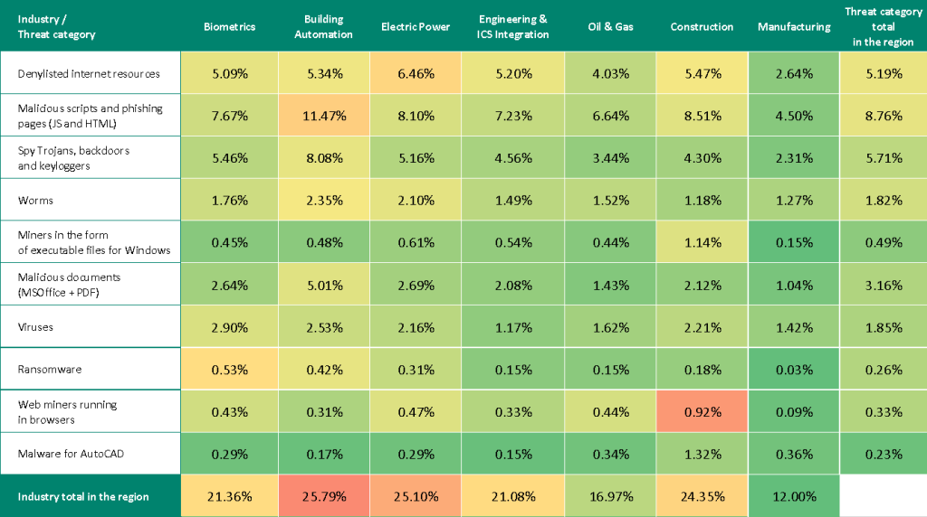 In the region, the percentage of ICS computers on which malicious objects were blocked was higher than the global average across all categories, except for denylisted internet resources, miners in the form of executable files for Windows, and malware for AutoCAD.