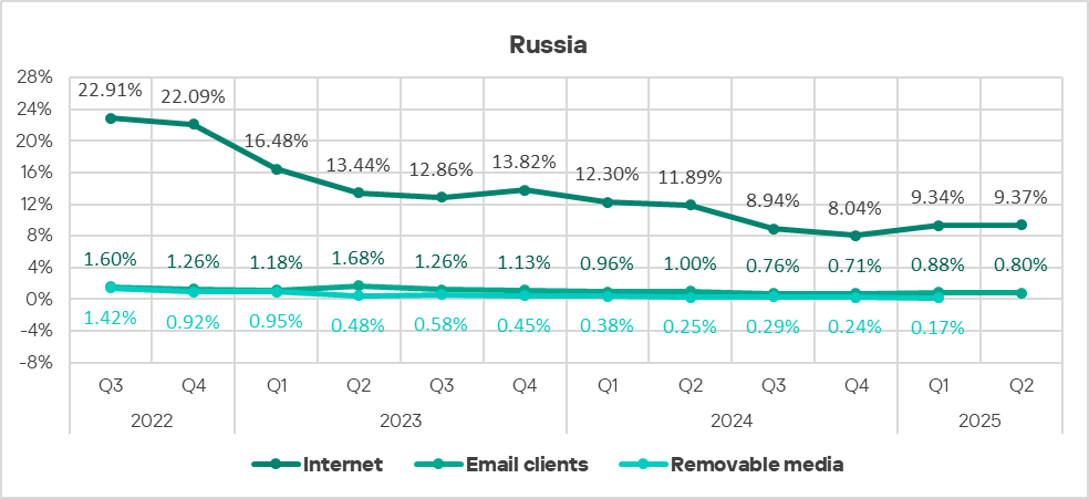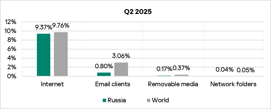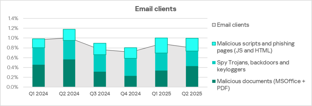 The percentage of ICS computers on which email client threats were blocked in Q2 2025 was the lowest in Russia among all regions, 0.8%.