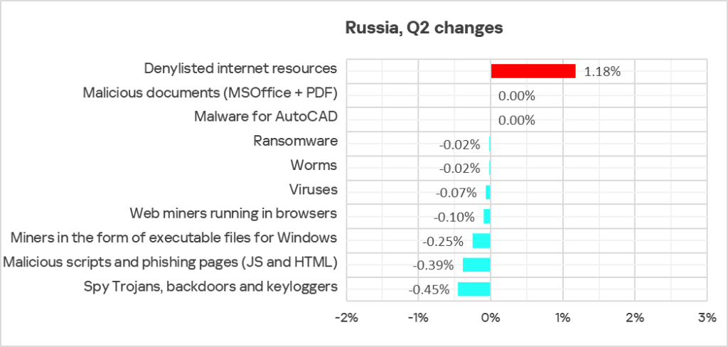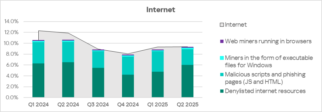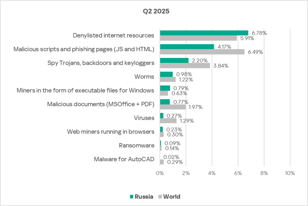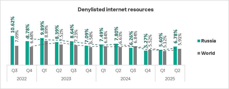 Denylisted internet resources are the undisputed leader in the ranking of threat categories in the region. This is the only category for which the indicator increased in Russia in Q2 2025.