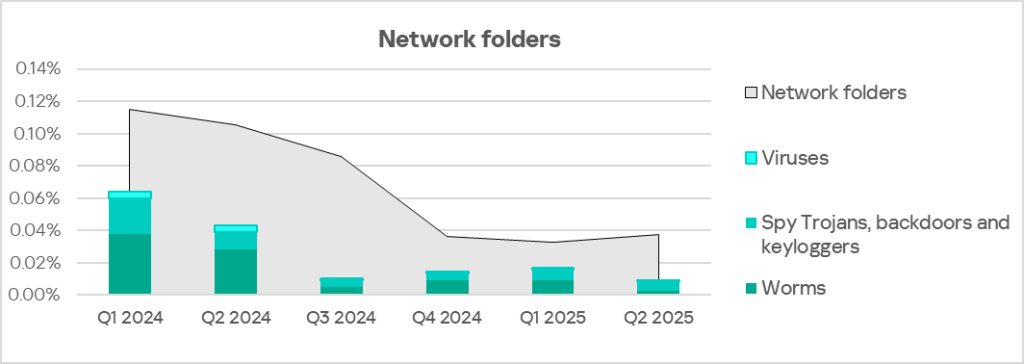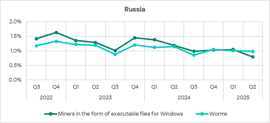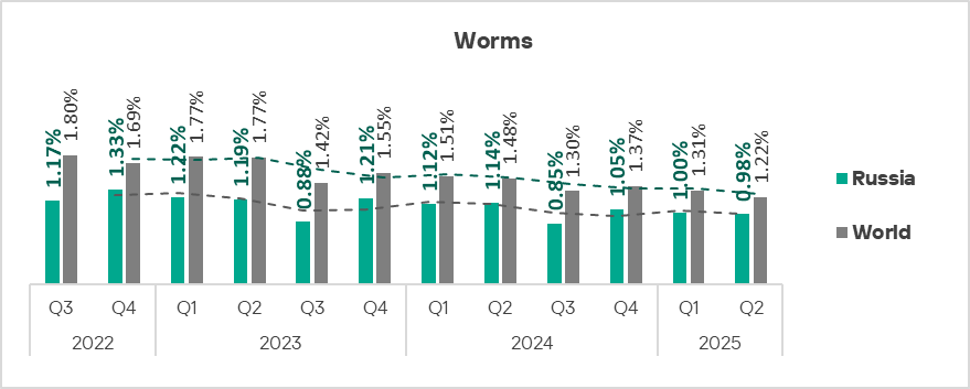 Worms in Q2 2025 climbed to fourth place in Russia in the ranking of threat categories. Besides Russia, only Central Asia and the South Caucasus region has such a high position for this threat category.