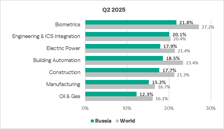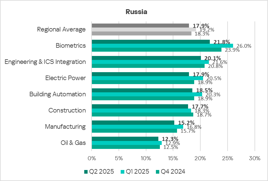 In Russia, of all the industries and OT infrastructures covered in the report, malicious objects are most often blocked in biometric systems.