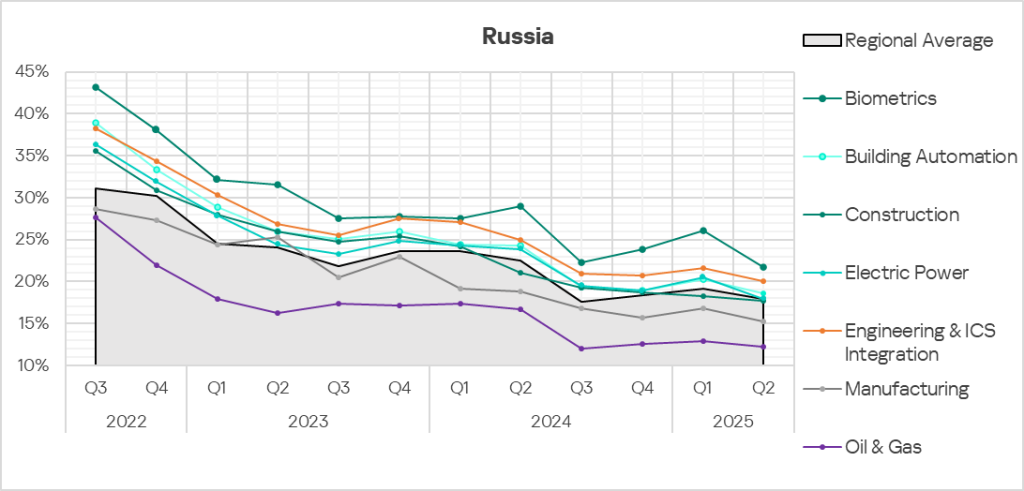 Threat source indicators for industries in Russia, Q2 2025