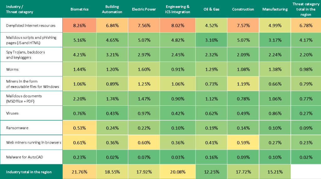 We use heatmaps to assess threats facing industries. On these maps, cells are colored from red to green, where red indicates the maximum value for a threat source or type among all regions and industries. In Russia, we observed the maximum value for denylisted internet resources blocked on computers in biometric system, as well as internet threats in engineering and ICS integrators.