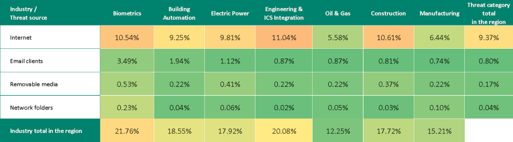In all industries, the main source of threats is the internet. Therefore, the current threat categories include denylisted links, malicious scripts and phishing pages, and spyware distributed through this threat source. In the electrical energy, construction, and oil and gas industries, the indicators for web miners are also high.