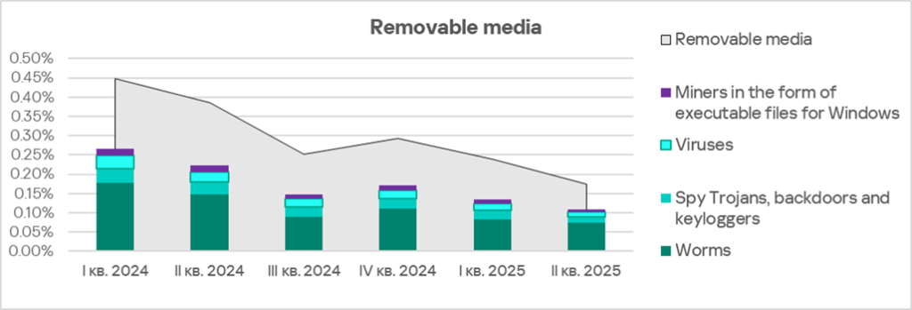 The main categories of removable media threats blocked on ICS computers in the region are worms, spyware, viruses, and miners in the form of executable files for Windows.
