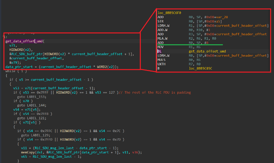 When handling an SDU packet received, its header fields are parsed. The packet itself consists of a mandatory header, optional headers, and data. Processing an optional header involves sequentially traversing each field in the header. This is done using the get_data_offset function. It parses the optional headers, collects the sizes of data fragments inside the data section, and returns a pointer to the data within the SDU packet. Important: according to the modem OS code analysis, information about the size of all concatenated PDUs inside an SDU is stored on the stack!