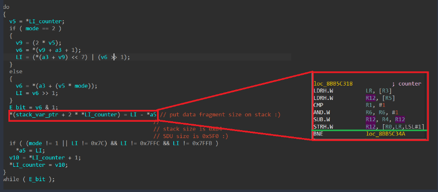 To locate SDU handling functions in the firmware among the vast number of different functions (about 75,000), it is sufficient to search for constants used in the process (0x7FFF, 0x7FFC, 0x7FFB). Among all occurrences of these constants, we identify those where they are meaningfully applied in the context of code execution. This yields a limited set of functions, including the function for handling an incoming SDU packet.