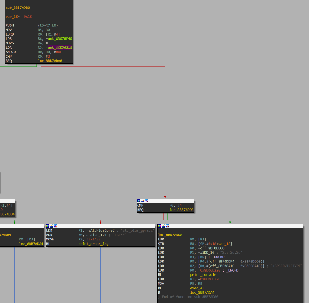 We will utilize the available AT command handler to ensure that we really can execute our code on the modem side. Since we do not know the current address of the stack frame where our data is located, nor whether the stack is executable at all, and we are unsure if code sections are writable (although we suspect they are not), the most reliable way is to move the data to RAM areas. To do this, we look for a suitable function among the available AT commands. The first appropriate command is SPSERVICETYPE.