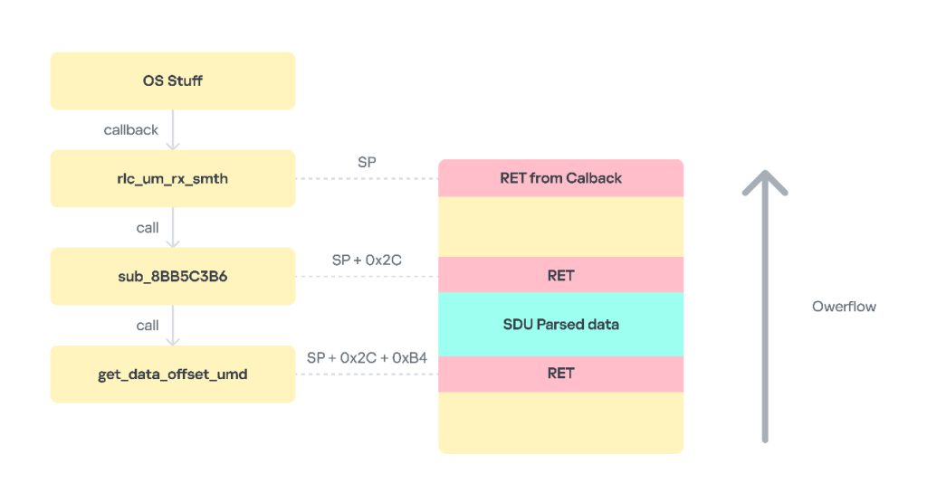 During our research, we identified several critical vulnerabilities at various levels of the Unisoc UIS7862A modem’s cellular protocol stack. This article discusses a stack-based buffer overflow vulnerability in the 3G RLC protocol implementation (CVE-2024-39432). The vulnerability can be exploited to achieve remote code execution at the early stages of connection, before any protection mechanisms are activated.