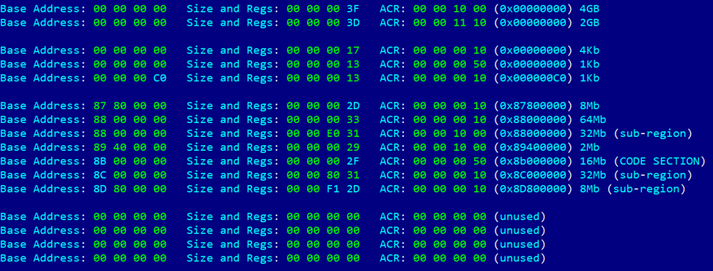 Next, by analogy, we input the address of the stack frame where our data is located. Unfortunately, it turns out that the stack is not executable. Now, we face the task of figuring out the MPU settings on the modem. Once again, using the ROP chain method, we generate code that reads the MPU table, one DWORD at a time. After many iterations, we obtain the following table.